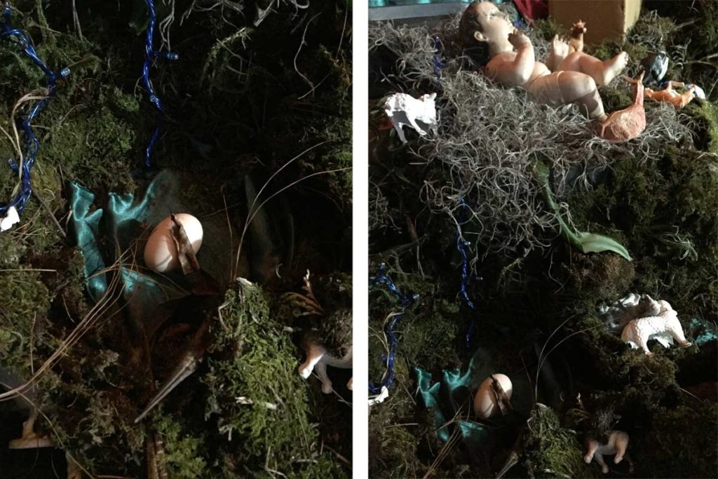 Frustrated in her attempts to worship, the chicken found her way into the priest’s home and onto an elaborate nativity scene. After the Liturgy, when we entered the home for lunch, we found the chicken standing victoriously over her gift to the Christ Child. It was the best thing she had to offer — a perfectly formed white egg.